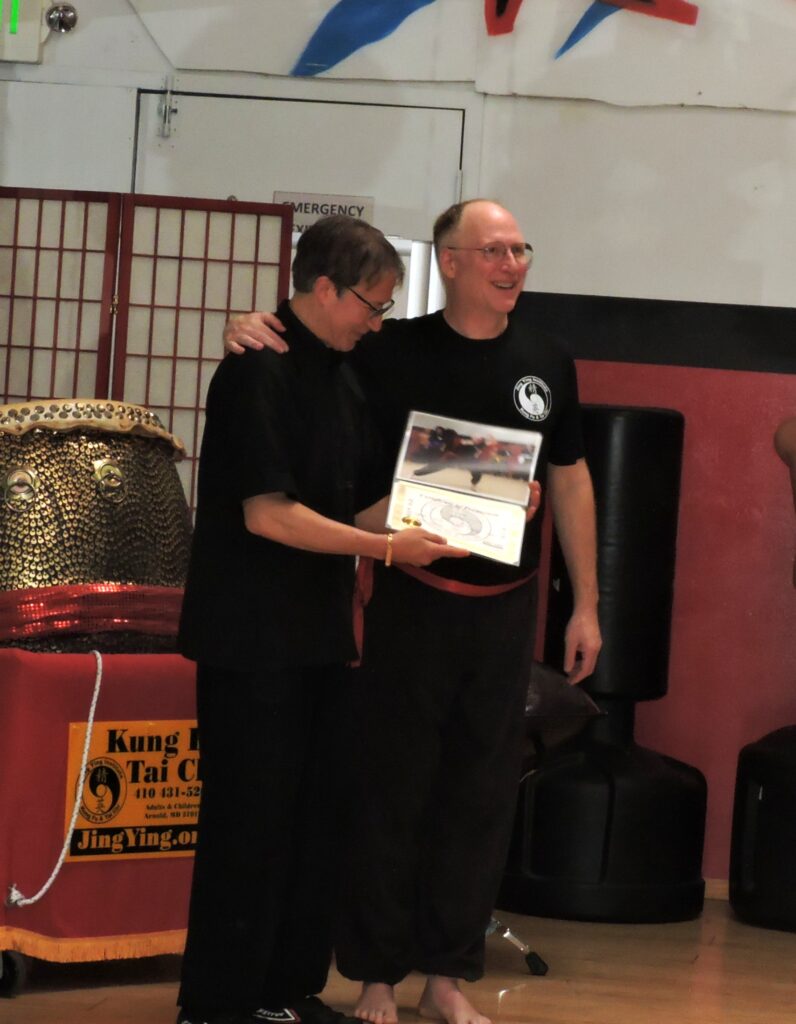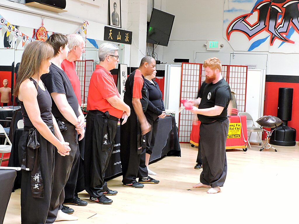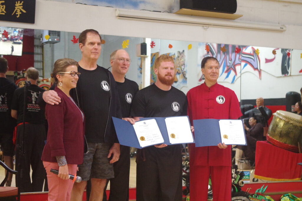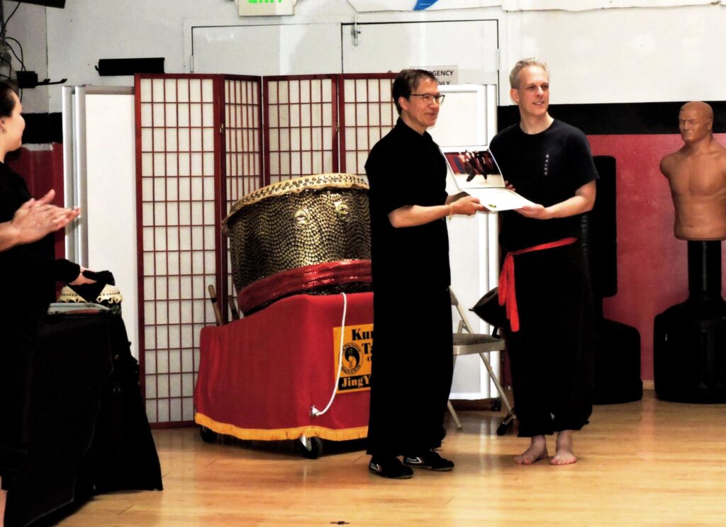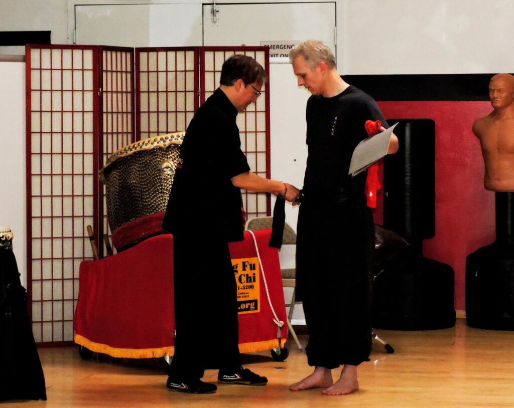 Then came the most important moments, the awarding of, not one, but two black sashes earned by long time Kung Fu and Tai Chi practitioners James Shey and Chris Selley.