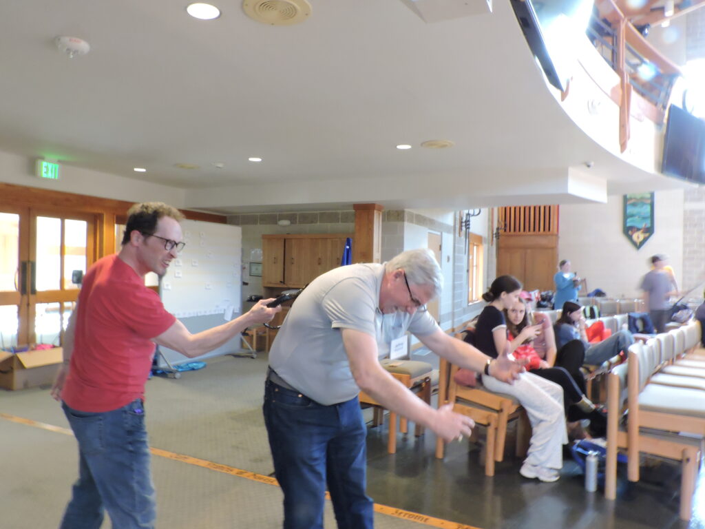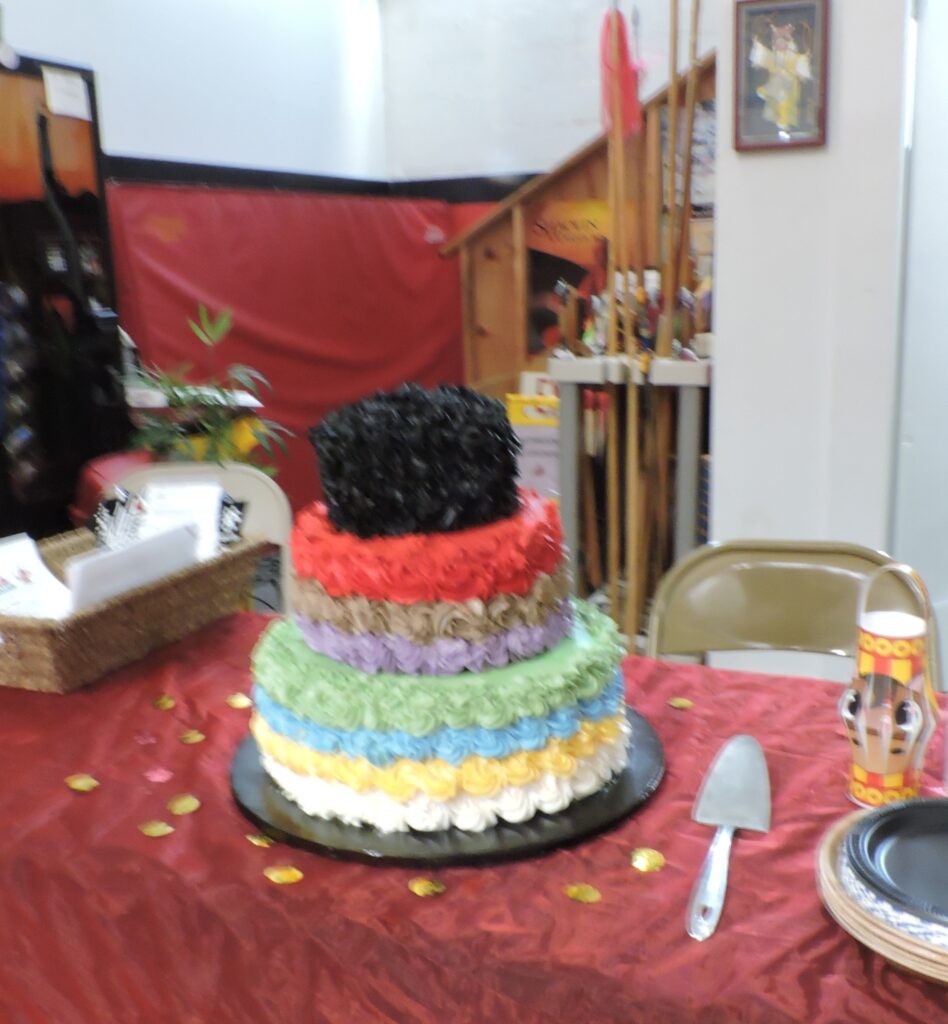 We’d earlier spied an amazing cake we learned was baked by Nicole Selley in honor of her husband Chris and James Shey’s accomplishment. Each layer was iced in a color representing the sash/belt levels from white to black. Each layer was also different, ranging from vanilla and chocolate to fruit-filled, and each was absolutely delicious.