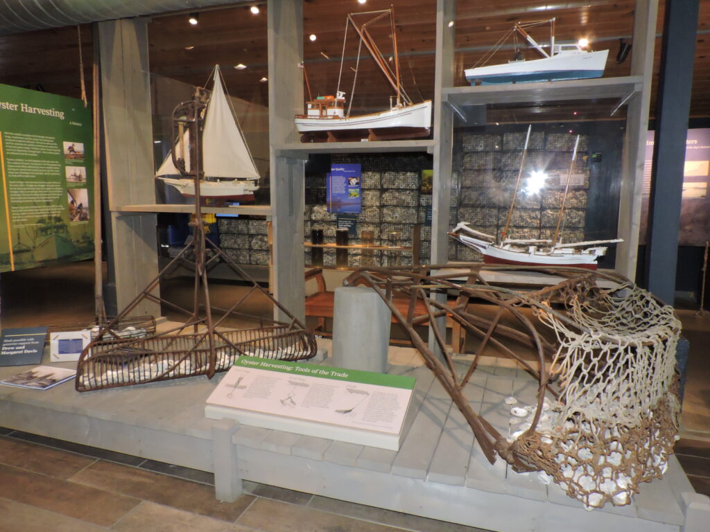 Opposite the display, we found an exhibit featuring Oyster Harvesting Tools of the Trade along with models of boats adapted for oystering like skipjacks , skipjack pushboats, buyboats, sharpies or dredges.