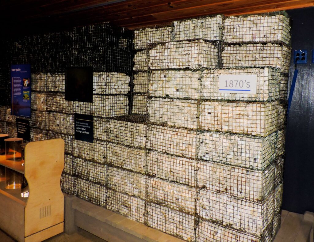 Behind them, against the far wall was one of the most impressive exhibits. Beneath a case featuring an NOAA buoy for monitoring water in the Chesapeake Bay were two small wire oyster cages filled with shells representing the small number of oysters available for harvesting from that spot in 2010. In contrast, to the right of the display were wire cages of shells piled high atop one another along the wall representing the number of oysters harvested from the same spot in the 1870’s.