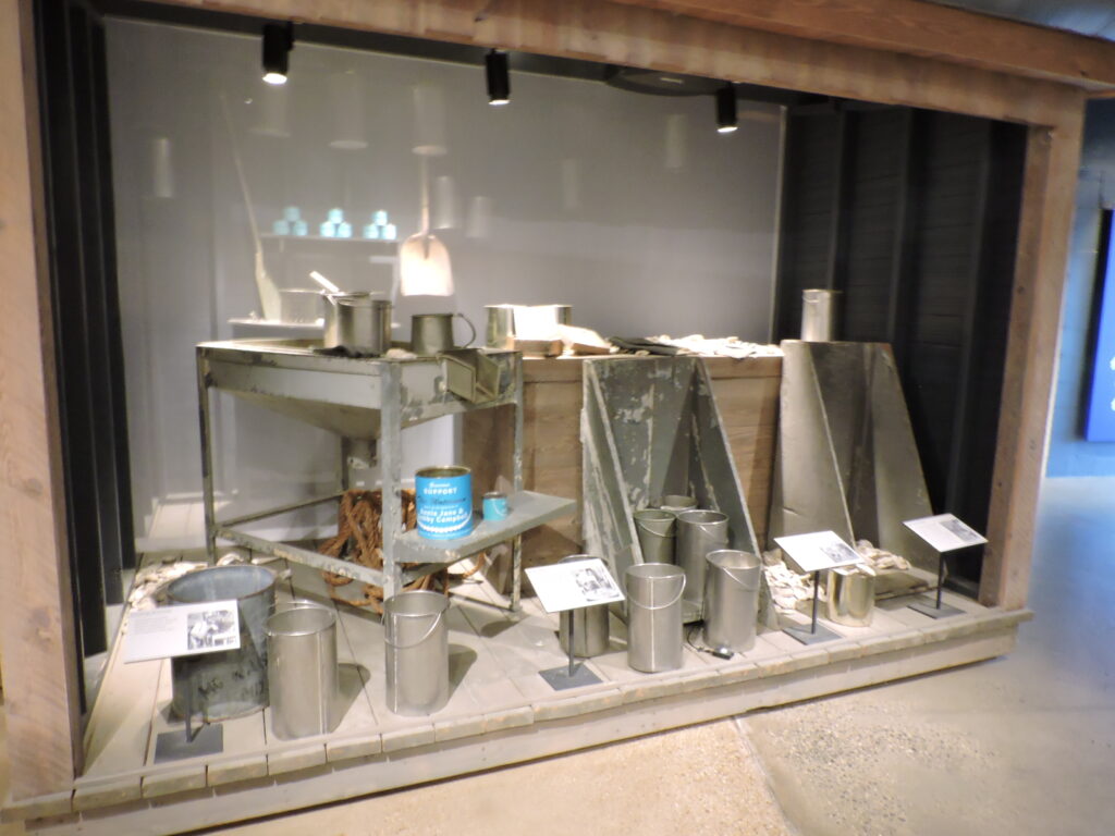 The packing plant operated for nearly a century. Below is an exhibit illustrating what shuckers’ stations were like. Once separated from the shells by hand with Shucker’s Knives, the oysters were placed in Shucker’s Buckets like those seen below filled with crushed ice, then passed on for packing and shipping.