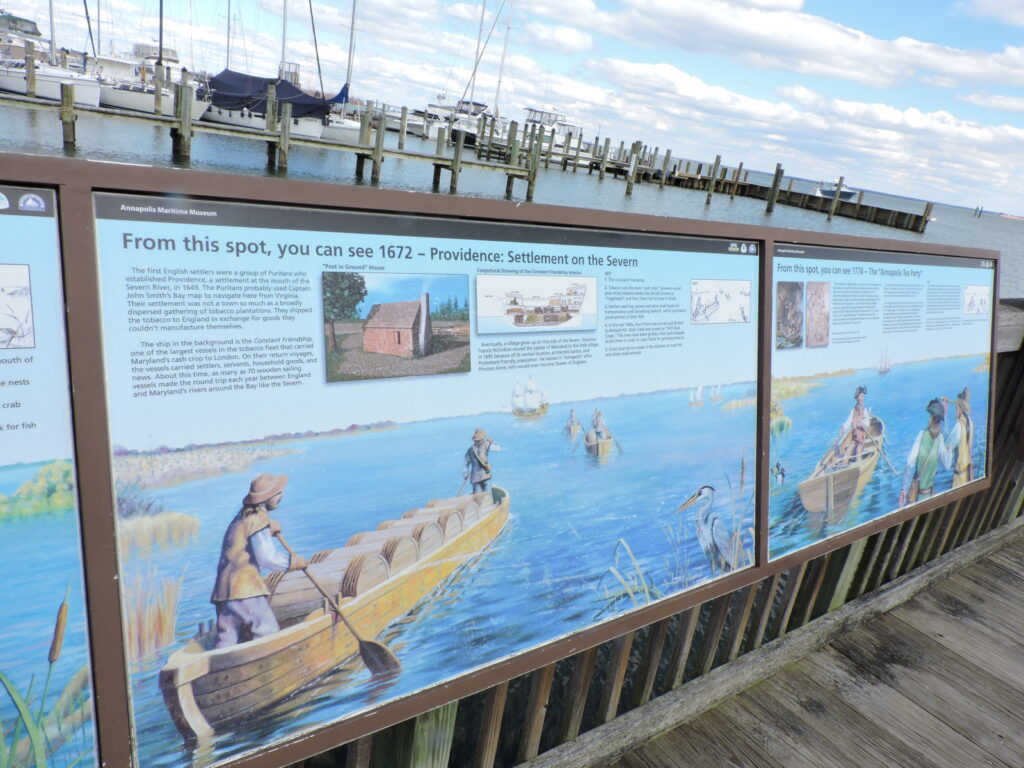 Lastly, on the recommendation of Diane Rosso, we journeyed out onto the boardwalk and piers surrounding the museum which provided a view of the waters of Back Creek. We loved the panels of artwork along the rails depicting important moments in time that could have been seen from point of land on which the Annapolis Maritime Museum sits.