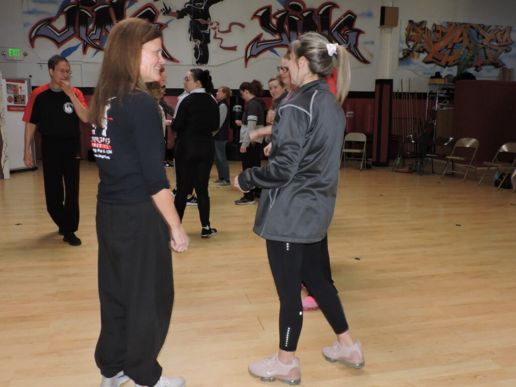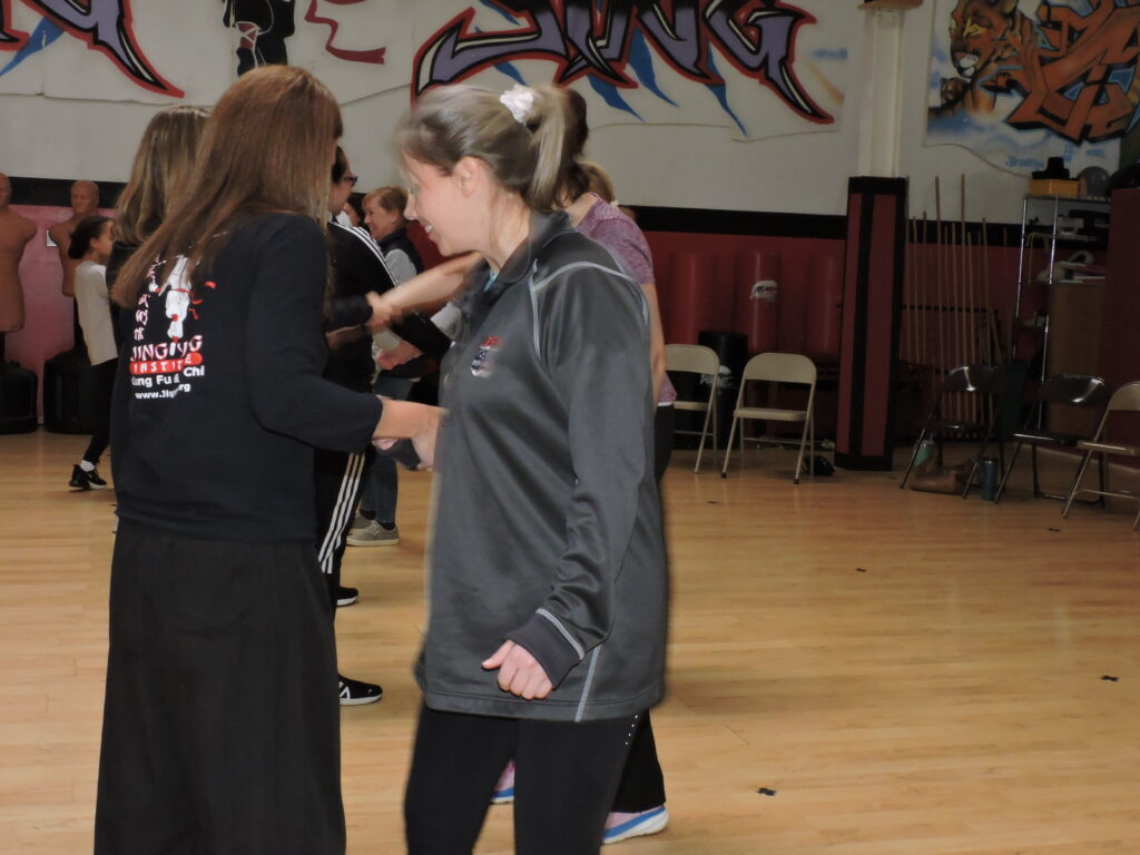 During those seven years and the years that followed, she assisted with or was involved as an instructor in numerous activities, programs and workshops. She’s seen below in 2024 with Kung Fu and Tai Chi participant Nikki Lee. The pair were assisting Jing Ying’s martial arts expert Billy Greer with the school’s Self-Defense Workshop for Women and Teens by demonstrating for workshop participants the series of escape techniques taught by Greer; then joining the participants in practicing them over and over.