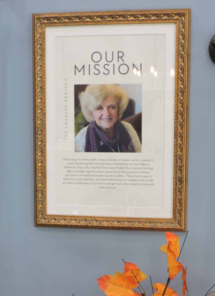 It took two years for Stewart to master the art of candle making but she became expert enough to make all the candles for the shop she’s just opened honoring her mother. A plaque with a photograph of Judith Lovejoy Stewart, occupies one wall. The mission for The LoveJoy Project can clearly be seen below the photo.
