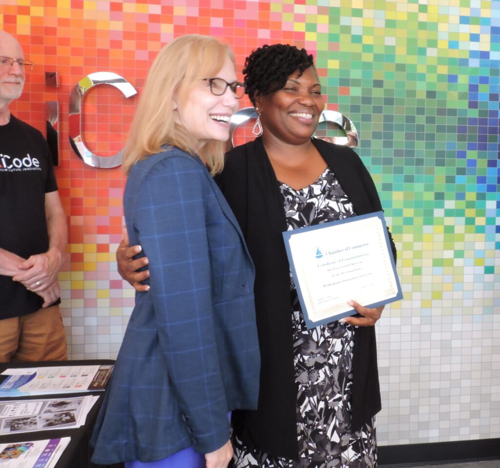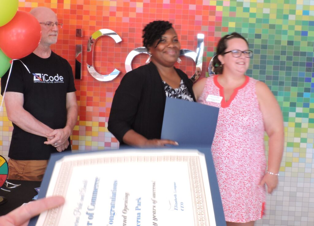 Chamber CEO Liz League, who oversaw the festivities, started things off with the offering of citations to iCode owners Mark and Sandra Sellers from a significant number of state, county and community organizations. They included citations from Anne Arundel County Executive Steuart Pittman’s office, the Anne Arundel County Council, Maryland House of Delegates member LaToya Nkongolo and fellow District 31 members Nicholaus Kipke and Brian Chisholm, Maryland State Delegate for District 33 Heather Bagnall, and one presented by Macaroni Kid’s Laura McElwain Colquhoun on behalf of the Anne Arundel Economic Development Corporation.