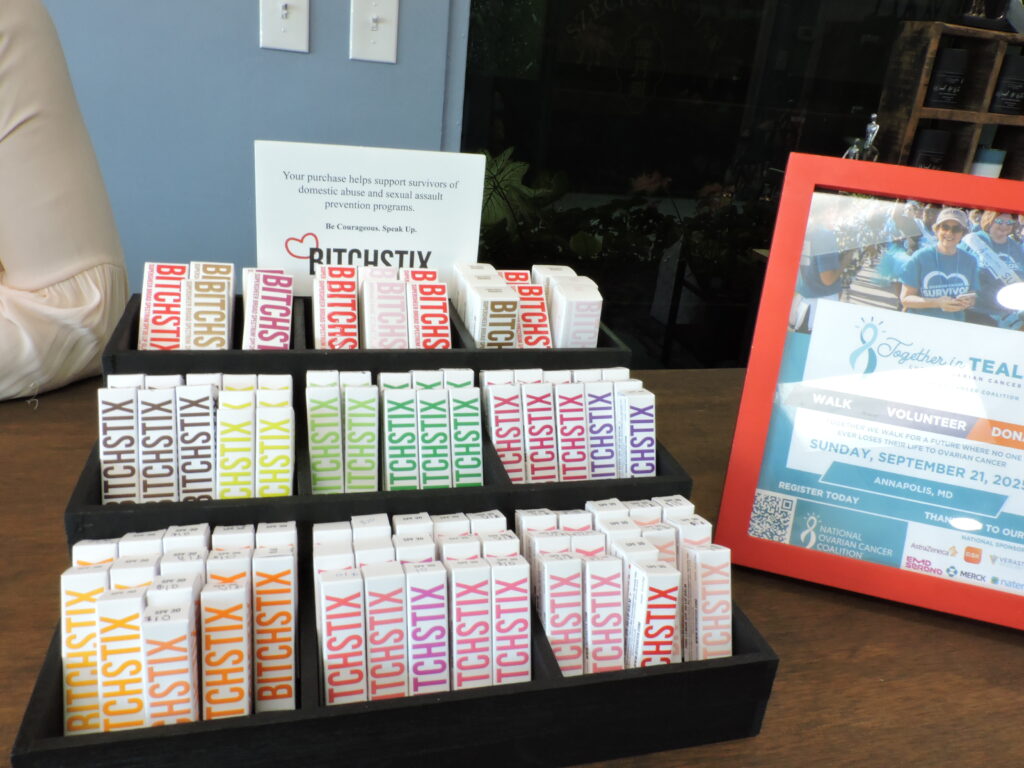 Sarah Vinje pointed out that Stewart also likes to feature healthy products from local businesses that give back. She carries a lip balm with the unusual name BitchStix, a self-care brand providing protection & promoting healing that donates a percentage of its proceeds to support survivors of domestic violence & sexual assault.