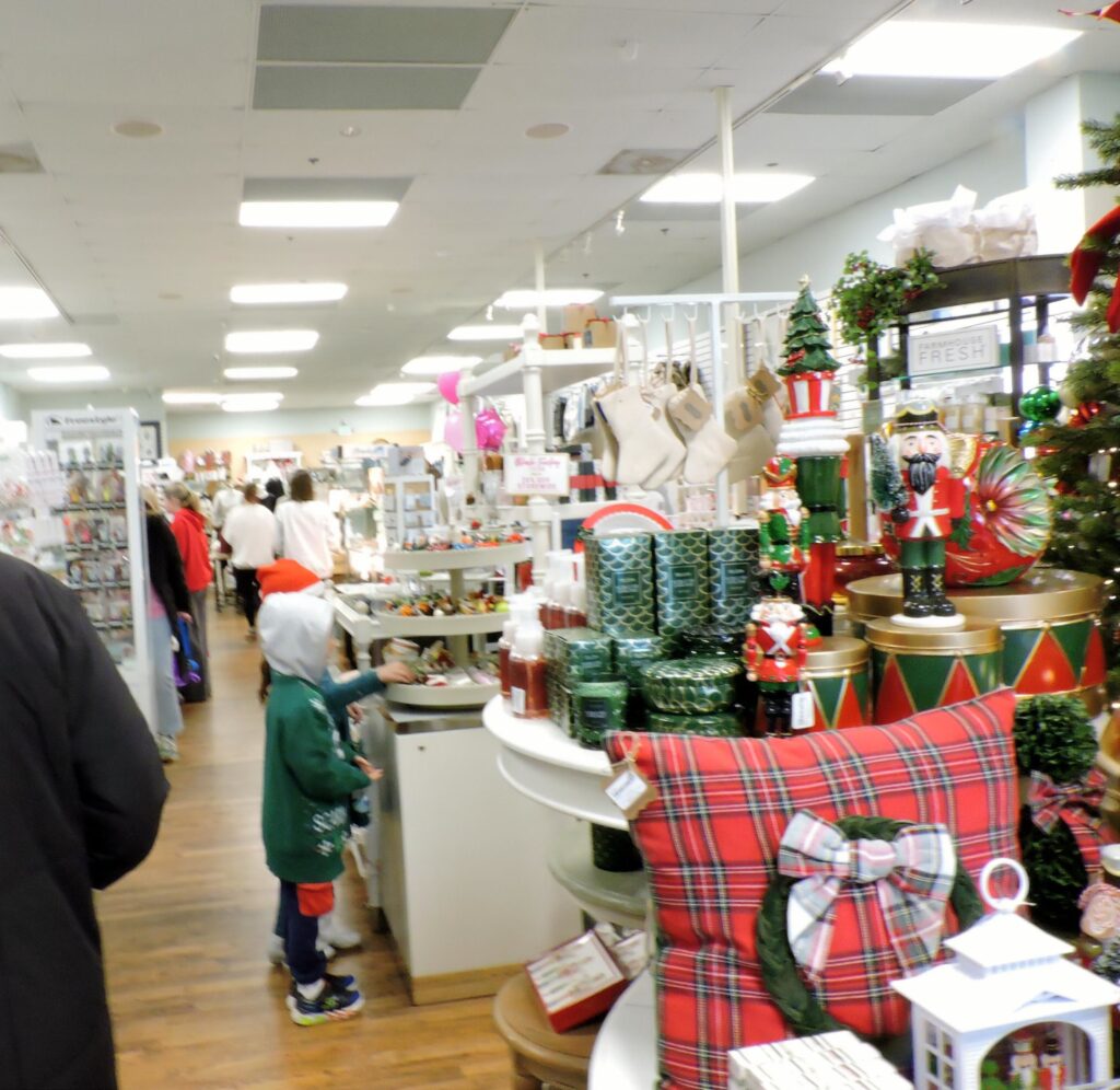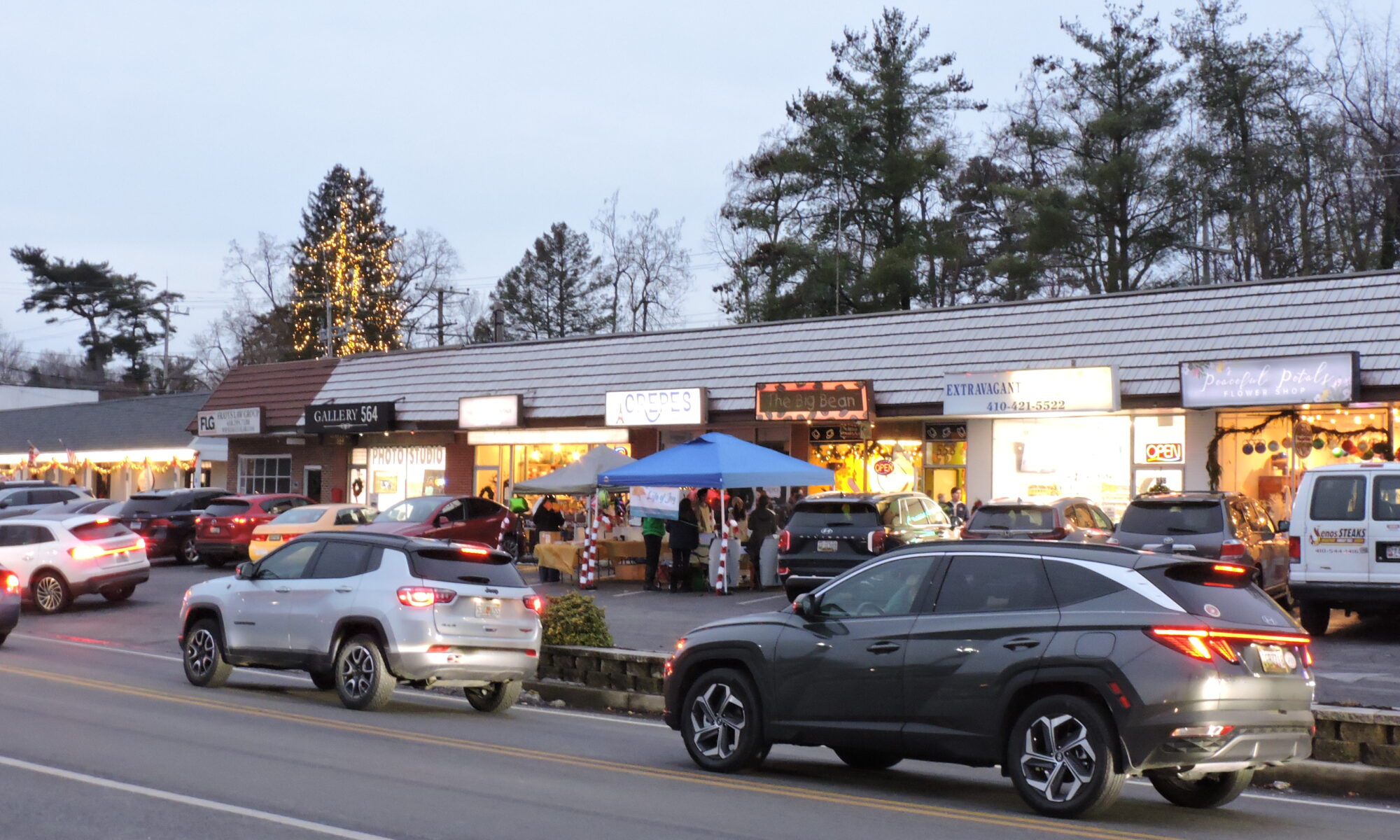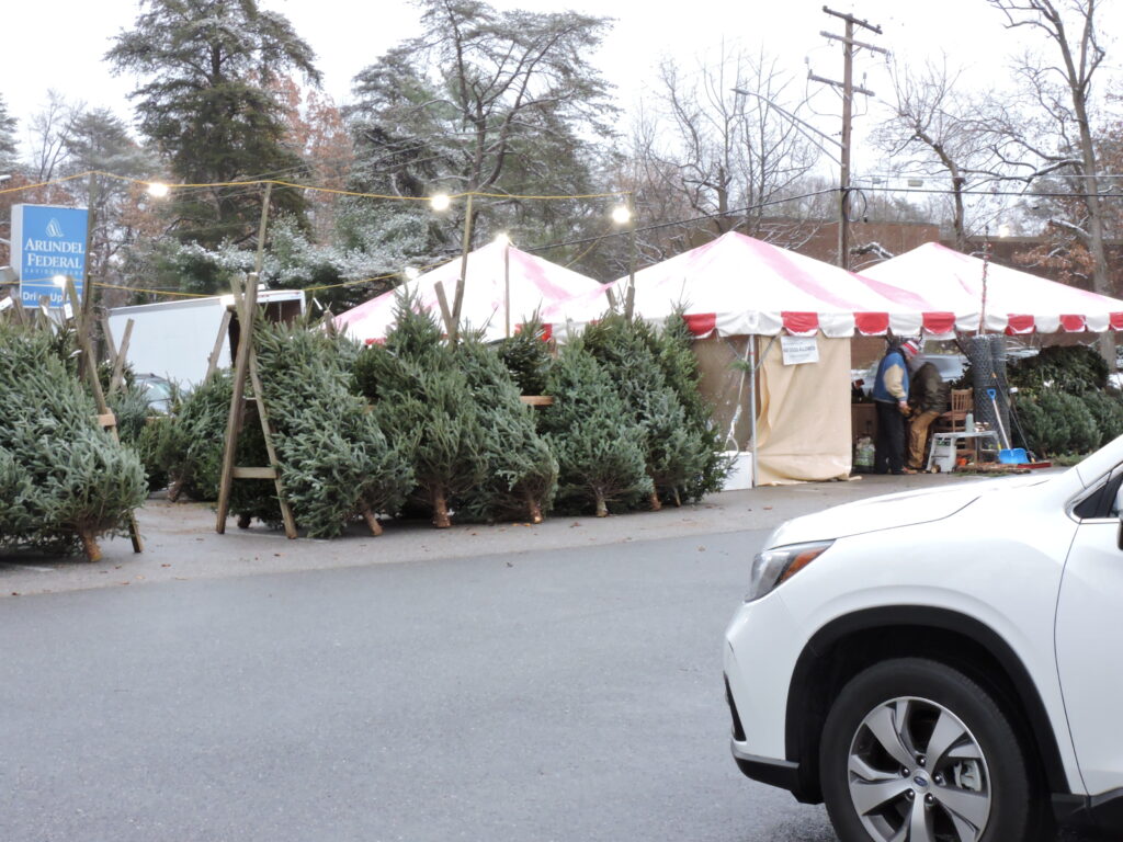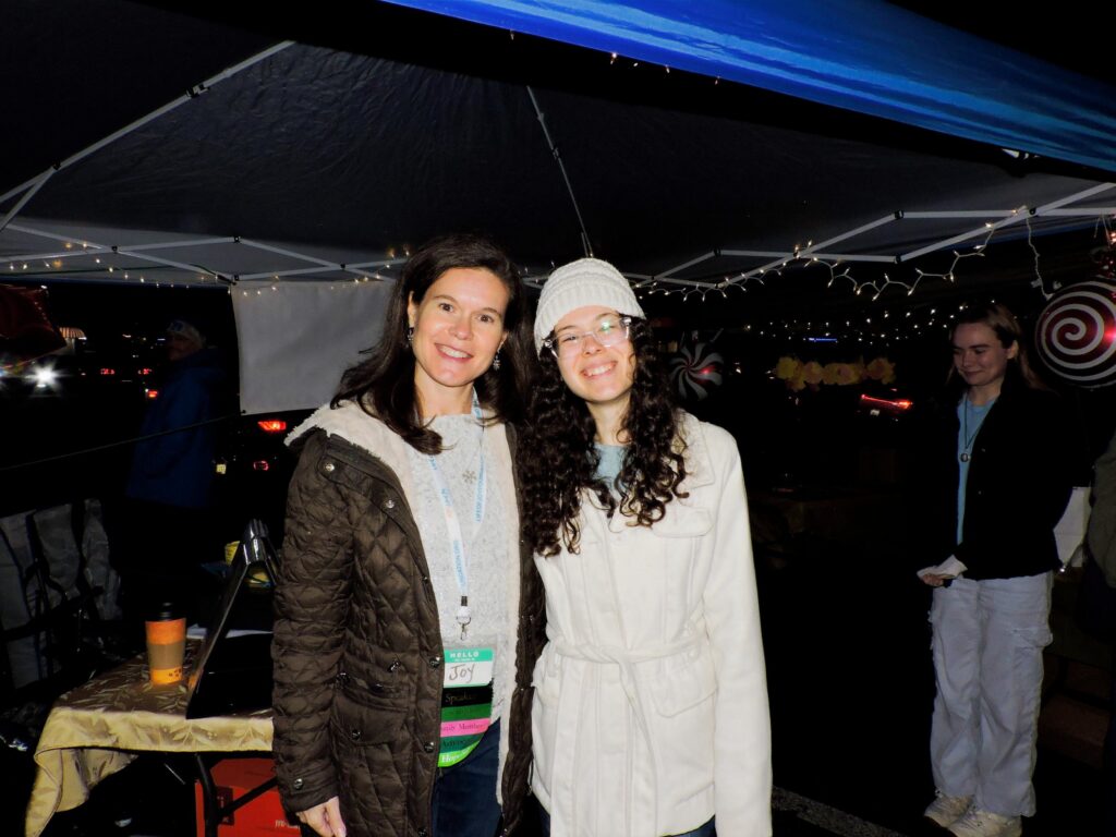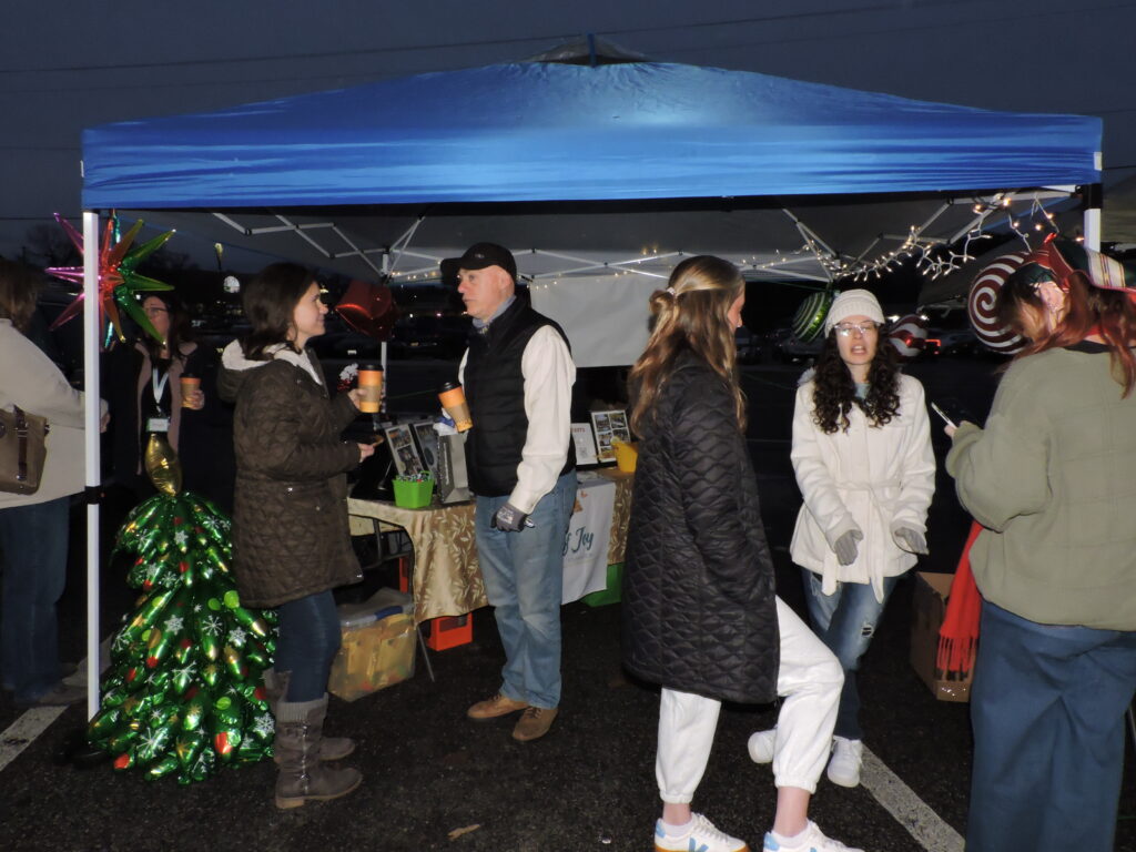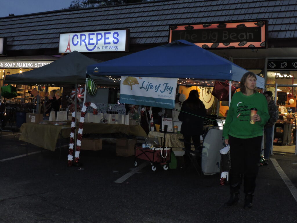 The sun was beginning to set as we turned onto Baltimore Annapolis Boulevard, passed by the strip of shops and turned into the parking lot opposite them. We could see, from a distance, that the Life of Joy tents were set up and already lively with activity. Decorated for the holidays, the shops behind the tents looked great and the lights on the Greater Severna Park & Arnold Chamber of Commerce’s giant evergreen beamed down on the town.